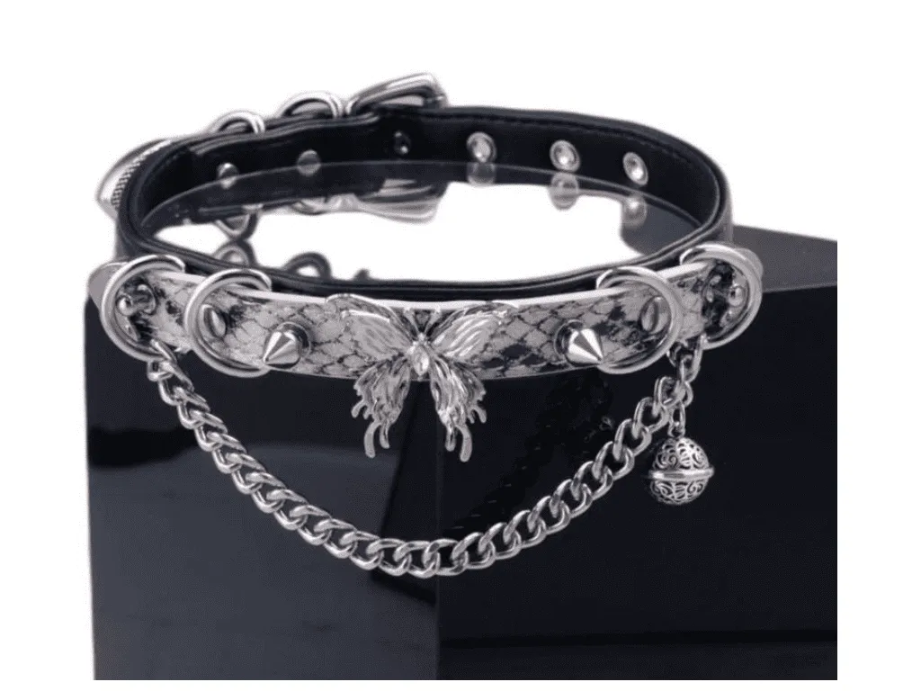 このチョーカーの特徴は、ベースは黒い首輪だが、前面がピンクのスネーク柄レザーで飾られていること。バタフライとチェーンのエレメントを加え、パンクと甘さを融合させている。蝶の両脇にあしらわれたシルバーのスパイク・スタッズが、タフなパンク・スタイルを強調している。
