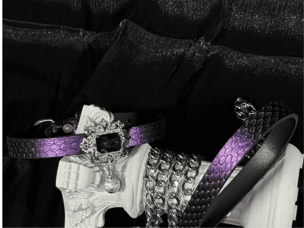 首輪にはパープルのメタリックな光沢のあるヘビ柄レザーを使用し、ミステリアスで威厳のある雰囲気を醸し出している。リーシュは太く大きなメタル・チェーン製で、力強く、支配と束縛を象徴している。
