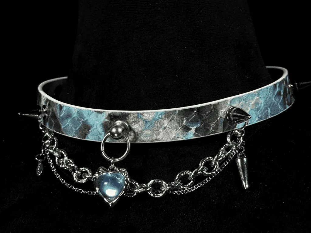 このチョーカーのデザインは矛盾に満ちている。鋭利なスタッズとチェーンが力強さと反抗心を表し、虹色の色彩とハートのペンダントが神秘性と柔らかさを添えている。ゴシック、パンク、BDSMカルチャーの融合が好きな人にぴったり。