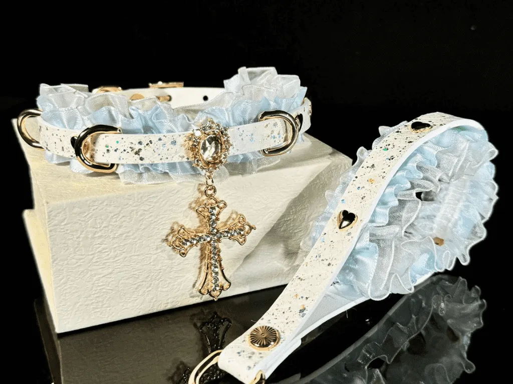 メインの襟にはラインストーンをあしらった大きなクロスのペンダントが付いており、豪華で人目を引くデザイン。バックルとペンダント・チェーンはゴールド。襟の内側または外側の縁には水色のプリーツレースが縫い付けられ、柔らかさとエレガントさを添えています。また、複数のDリングがあり、さまざまな牽引効果が期待できます。