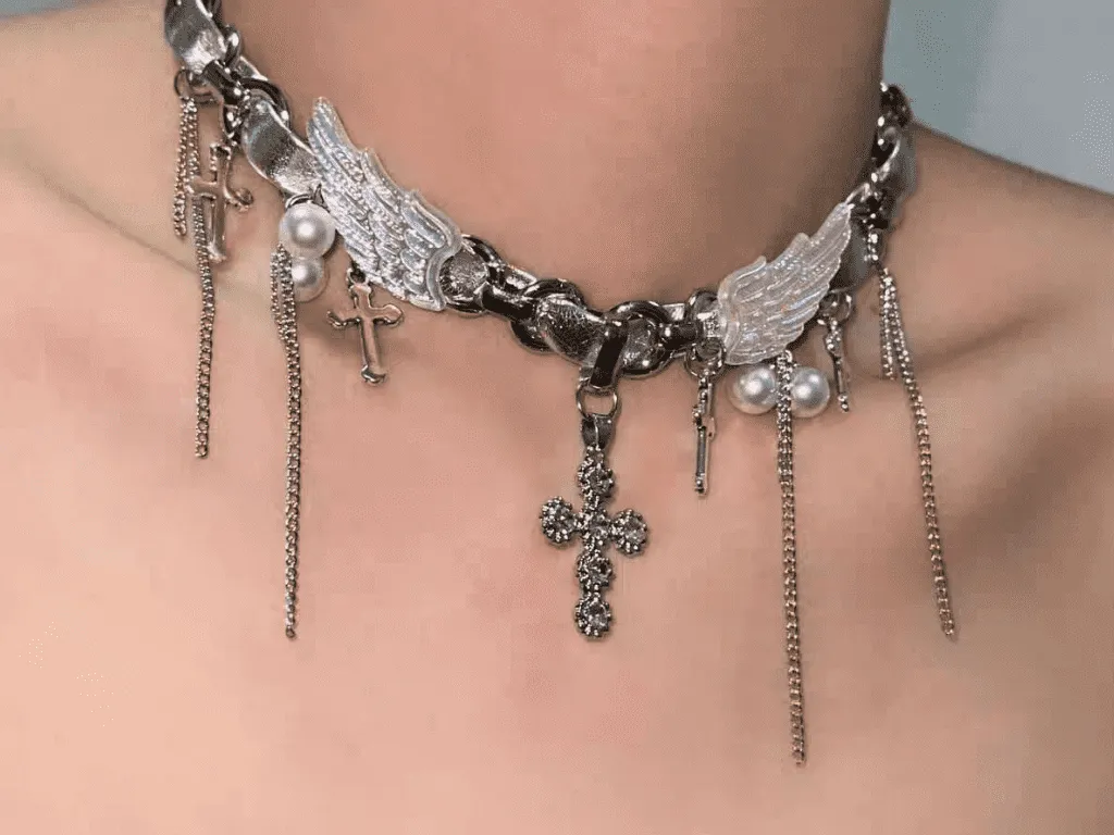 チョーカーの中央には、天使やドラゴンの翼のようなメタリックな光沢を放つ半透明の翼のペンダントが2つ付いており、製品に幻想的な要素を加えている。