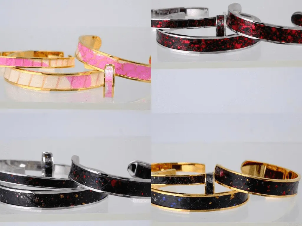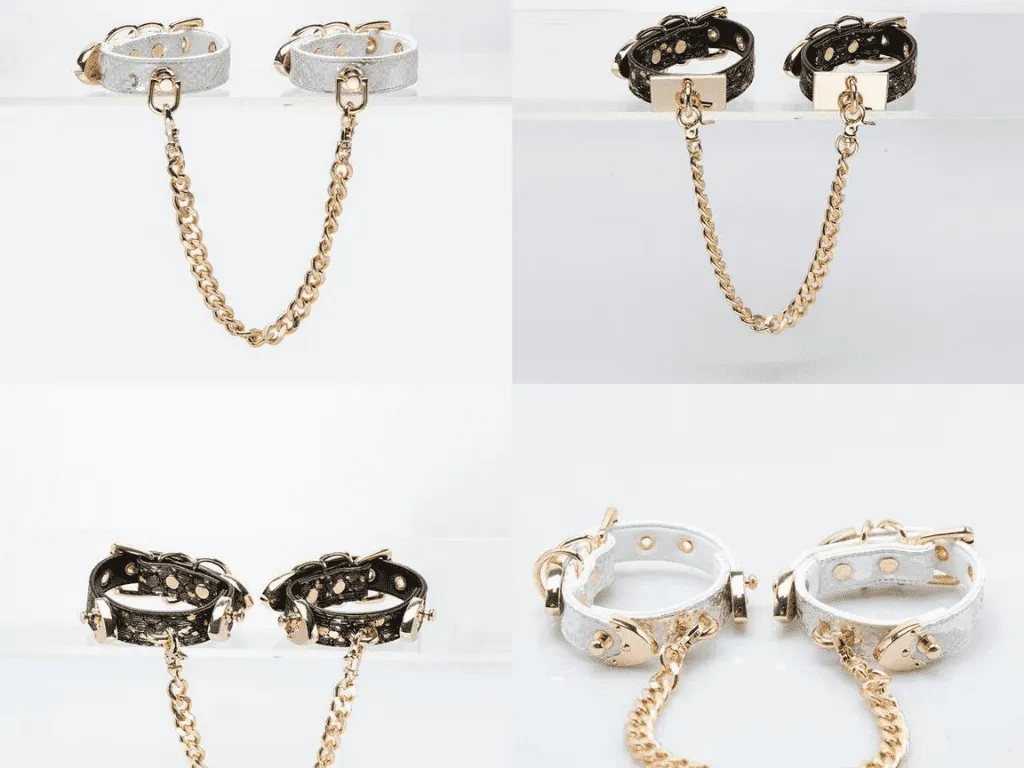 淡いピンクにクリーム色の筋、深い赤に黒い斑点、星のような黒にゴールドの斑点など、大胆でカラフルな模様が目を引くデザインで、光沢のあるゴールドやシルバーのフレームにあしらわれている。カフスは滑らかな曲線を描き、モダンな印象。印象的なまだら模様は、それぞれのペアをユニークで楽しいものにし、ボンデージ・ギアに新鮮な魅力を加えていると思う。