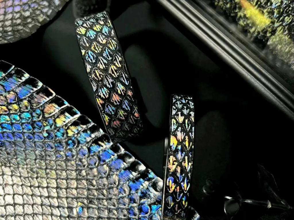 私はいつもスネーク・スケール・レザーに惹かれてきたが、この玉虫色のレインボー・バージョンは本当に目立つ。鱗模様は光の加減でブルー、パープル、グリーン、そしてゴールドのタッチを反射する。黒の背景とドクロの装飾と組み合わせることで、大胆でエッジの効いた外観となり、ボンデージの美学に完璧にフィットする。カフスは滑らかで光沢があり、鏡のような仕上げが鮮やかな色を際立たせ、シンプルながら洗練されたスタイルを与えている。